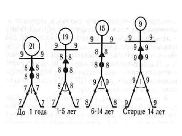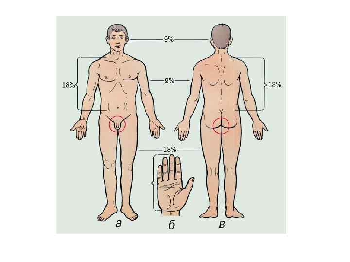 Способы определения площади ожога - Правило ладони: ладонь человека = 1, 1% - Правило девяток: а) голова и шея = 9% б) передняя часть туловища - 9 х2=18% в) задняя часть туловища - 9 х2 = 18% г) верхняя конечность - 9 х2 = 18% д) нижняя конечность - 18 х2 = 36% д) промежность = 1% ______________всего: 100% Тело человека в среднем равно 16 -20 тысячам см²