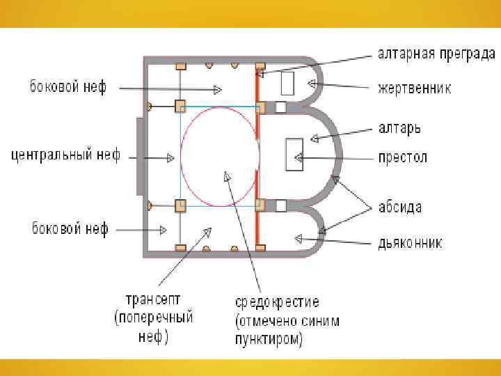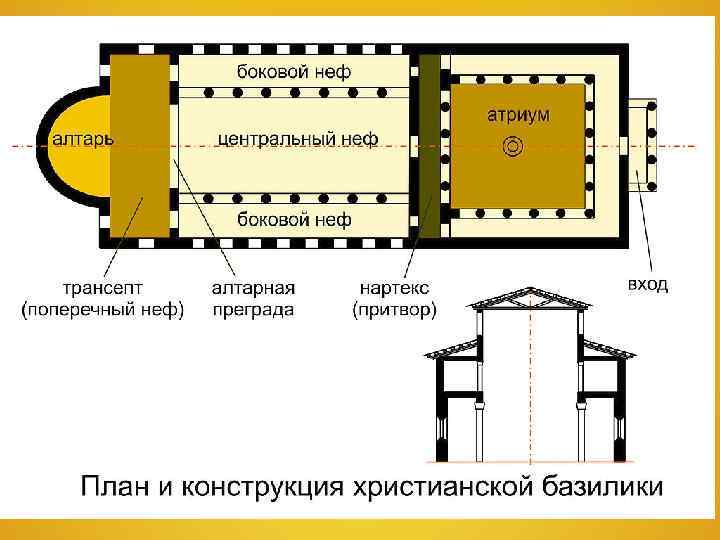Строились церкви двух основных типов: базилики и крестово-купольные церкви Базилики представляли собой прямоугольные, вытянутые в длину здания, разделенные на продольные помещения — нефы( от греч. корабль), из которых средний был выше боковых. Часто они пересекались широким поперечным нефом, образуя в плане вытянутый, так называемый латинский крест. В восточной части базилики находился алтарь (священная часть храма). К входу часто примыкает атриум, окруженный крытой колоннадой. Внешний вид скуп и строг, и богатые
