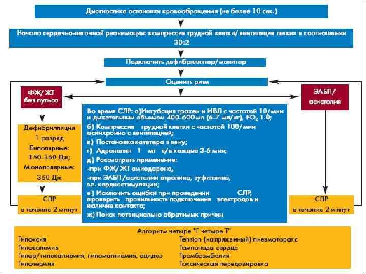 • г) Асистолия может следовать за ФЖ или развиваться вследствие значительного повышения парасимпатического тонуса. Мелковолновая ФЖ напоминает асистолию, поэтому оправдан начальный разряд 200 Дж • - немедленная СЛР • - эпинефрин 1 мг в/в или атропин 1 мг в/в или . . . повторно через 5 мин в общей дозе 3 мг • - при неэффективности Nа бикарбонат в/в • - при неэффективности медикаментозной терапии - возможно применение кардиостимуляции