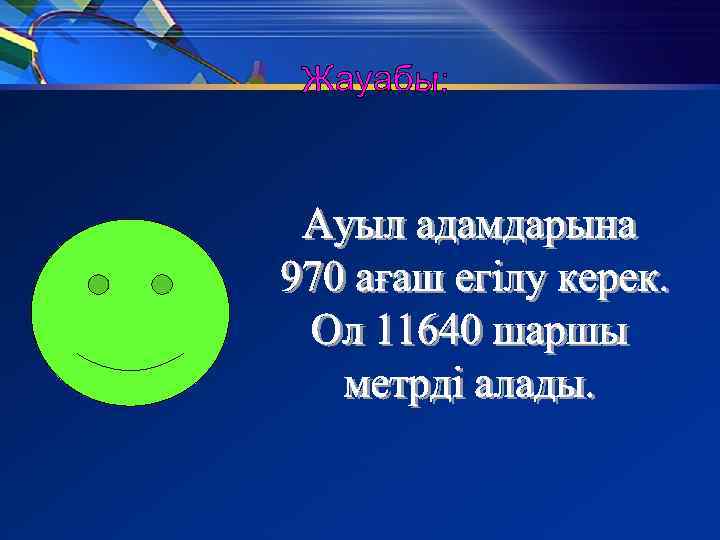 Тыныс алу “арифметикасы” Ақсу ауылында 1940 адам тұрады. Биіктігі орташа бір ағаш екі адамды оттекпен қамтамасыз етеді. Ағаштың қоректену ауданы 12 шаршы метр. Ауыл тұрғындарын толық оттекпен қамтамасыз ету үшін қанша ағаш өсіру керек және ол ағаштар қандай ауданға егілмек?