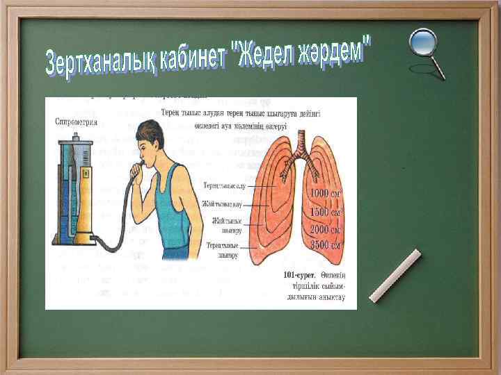 Өкпенің тіршілік сыйымдылығы 3500 мл Ауаның тыныстық көлемі 500 мл Ауаның қосымша көлемі 1500 мл ауа Ауаның қордағы көлемі 1500 мл ауа Қалдық ауа сыйымдылығы – 1200 мл ауа