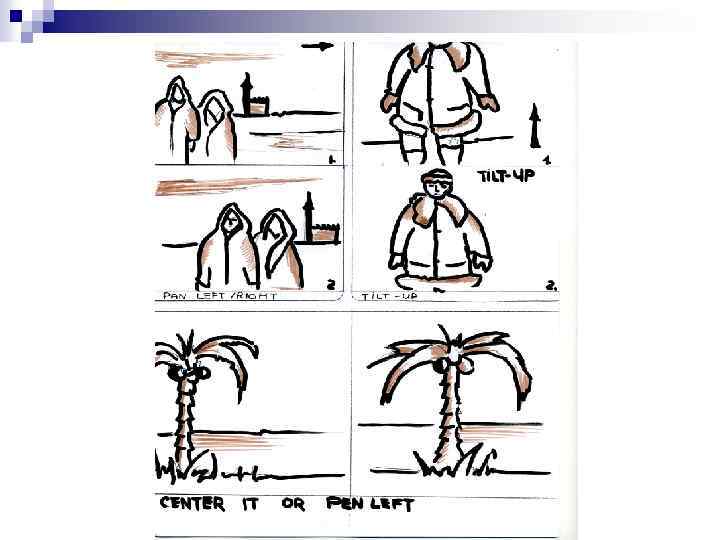 Команды - указания режиссера по визуализации кадра / Director’s visualization cues Команды по композиции кадра должны быть понятны оператору. (корректировка композицию кадра) n n 1. n n n Pan left – горизонтальное панорамирование влево Pan right – горизонтальное панорамирование вправо Tilt up – вертикальное панорамирование вверх Tilt down - – вертикальное панорамирование вниз Pad up, or crane down – взлет(стремительный) или падение (головокружительное) Dolly in – (тележка) – наезд (и без тележки) Dolly out – (тележка) отъезд (и без тележки) Zoom in, or tighter – приближение Zoom out, or looser - отдаление Truck right / light (на тележке) горизонт панорама. Вправо / Влево Arc right / light left – движение дугой (с руки и на рельсах)