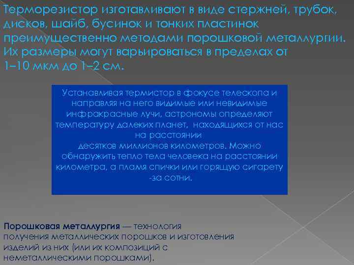 Терморезистор изготавливают в виде стержней, трубок, дисков, шайб, бусинок и тонких пластинок преимущественно методами порошковой металлургии. Их размеры могут варьироваться в пределах от 1– 10 мкм до 1– 2 см. Устанавливая термистор в фокусе телескопа и направляя на него видимые или невидимые инфракрасные лучи, астрономы определяют температуру далеких планет, находящихся от нас на расстоянии десятков миллионов километров. Можно обнаружить тепло тела человека на расстоянии километра, а пламя спички или горящую сигарету -за сотни. Порошковая металлургия — технология получения металлических порошков и изготовления изделий из них (или их композиций с неметаллическими порошками).