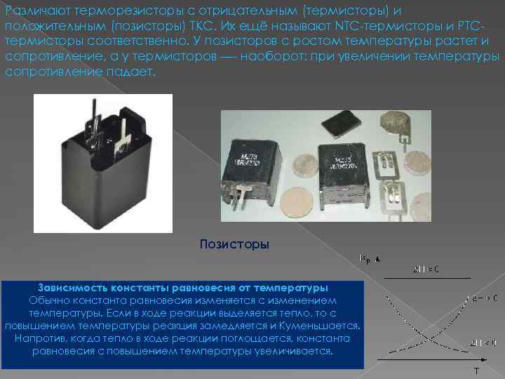 Различают терморезисторы с отрицательным (термисторы) и положительным (позисторы) ТКС. Их ещё называют NTC-термисторы и PTCтермисторы соответственно. У позисторов с ростом температуры растет и сопротивление, а у термисторов —- наоборот: при увеличении температуры сопротивление падает. Позисторы Зависимость константы равновесия от температуры Обычно константа равновесия изменяется с изменением температуры. Если в ходе реакции выделяется тепло, то с повышением температуры реакция замедляется и Kуменьшается. Напротив, когда тепло в ходе реакции поглощается, константа равновесия с повышением температуры увеличивается.