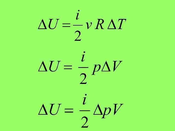 Внутренняя энергия тела определяется по формулам i – число степеней свободы i = 3 для одноатомного, i = 5 для двухатомного, i = 6 для многоатомного газа;