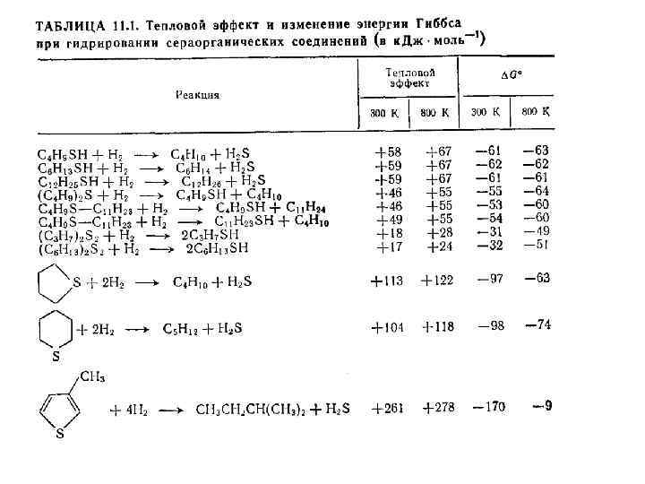 13. 2. Химия, кинетика и термодинамика реакций гидроочистки Химизм процессов гидроочистки сводится к деструкции связей С-S, С-N, С-О. Скорость гидрогенолиза сернистых соединений возрастает в ряду: тиофены и диарилсульфиды (условно 1) -> алкилсульфиды (3, 2 -4, 4) -> тиациклопентаны (3, 8 -4, 1) -> дибензилсульфид (7, 0) -> меркаптаны (7, 0). Гетероатомные соединения подвергаются гидрогенолизу быстрее, чем углеводороды, поэтому гетероатомы удаляются из сырья в виде сероводорода, аммиака и воды. Легче всего удаляется сера, далее следует кислород, наиболее устойчив азот. 1) Меркаптаны гидрируются до сероводорода и соответствующего углеводорода: RSH +Н 2 —> RH + H 2 S. 2) Сульфиды гидрируются через образование меркаптанов: 3) Дисульфиды также гидрируются до сероводорода: RSH +Н 2 —> RH + H 2 S