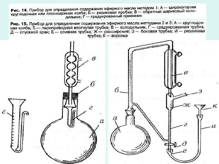 Количественное определение содержания эфирных масел в ЛРС основано на перегонке эфирных масел с водяным паром. Согласно закону парциального давления Рауля, в смеси компоненты закипают раньше, чем каждый из них достигает своей температуры кипения. Так, смесь скипидара и воды начинает кипеть и перегоняться при 95, 5ºС (вместо 160ºС – температуры кипения пинена, основного компонента скипидара). Аналогично другие эфирные масла: кипят при температуре ниже 100ºС, хотя точка кипения лимонена 177ºС, гераниола 229ºС, тимола 233ºС. В ГФ РБ (т. 1; 2. 8. 12) описаны 5 методов, применяемых для методов перегонки эфирных масел с водяным паром и определения количественного содержания их в ЛРС. Первый метод (в ГФ РБ – это метод B) связан с применением прибора Гинзберга; Гинзберга второй, третий и четвертый (в ГФ РБ они описаны как методы второй А, С и D) – аппарата Клевенджера, четвертый (в ГФ РБ идет Клевенджера как метод Е) – с модификацией аппарата Клевенджера