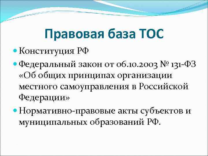 Правовая база ТОС Конституция РФ Федеральный закон от 06. 10. 2003 № 131 -ФЗ «Об общих принципах организации местного самоуправления в Российской Федерации» Нормативно-правовые акты субъектов и муниципальных образований РФ.