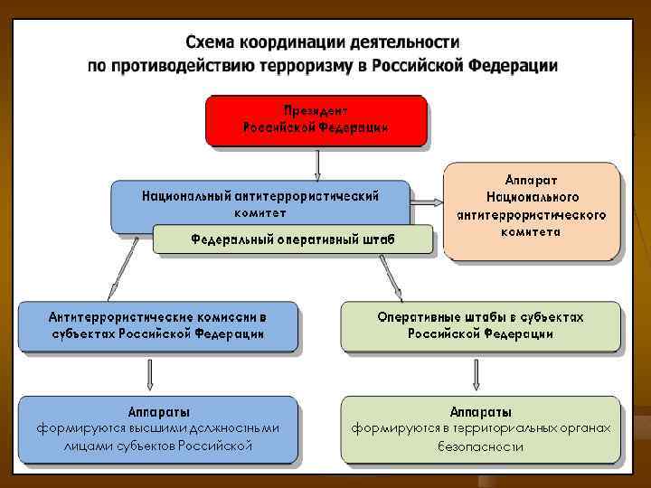 В нашем государстве в 2006 году принят закон «О противодействии терроризму» , в котором к террористической деятельности относятся: n n n организация, планирование, подготовка и финансирование террористического акта; - подстрекательство к террористическому акту; - организация незаконного вооруженного формирования, преступного сообщества (преступной организации), организованной для совершения террористического акта, а также участие в такой группе; - вербовка (вовлечение), вооружение, обучение и использование террористов; - помощь в планировании, подготовке или совершении террористического акта; - пропаганду идей терроризма, призывы к террористическим актам, оправдание террористической деятельности.