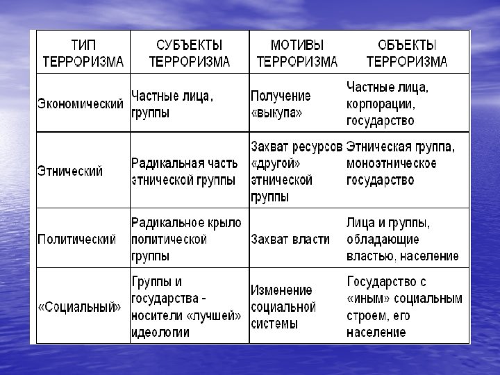 • 1995, 14 -20 июня — рейд Басаева на Будённовск (Россия), массовый • • • захват заложников в здании больницы. Погибло более 200 человек. 1995, 25 июля — взрыв газового баллона на станции Saint Michel (Франция), 8 человек было убито, 200 получили ранения. Вооружённая Исламская Группа. 1995 6 октября — взрыв газового баллона на станции парижского метро Maison Blanche, 30 человек получили ранения. Вооружённая Исламская Группа. 1995, 17 октября — взрыв газового баллона на станции Orsay (RER B), 30 человек получили ранения. Вооружённая Исламская Группа. 1996, 9 -15 января — рейд Радуева на Кизляр (Россия). Захват больницы. 1996, 11 июня около 21: 00 на перегоне между станциями «Тульская» и «Нагатинская» в вагоне поезда сработало самодельное взрывное устройство. 1996 -22 апреля 1997 — захват посольства Японии в Перу. Революционное движение имени Тупак Амару. 1997, 28 июля — двое террористов-смертников подорвали себя на рынке Иерусалима. 15 человек погибло. Ответственность на себя взяла организация Хамас. 1998, 7 августа — террористы-смертники организовали взрывы возле посольств США в Кении и Танзании. Погибло 225 человек, ранено более 4000. 1999 — взрывы жилых домов в Москве.