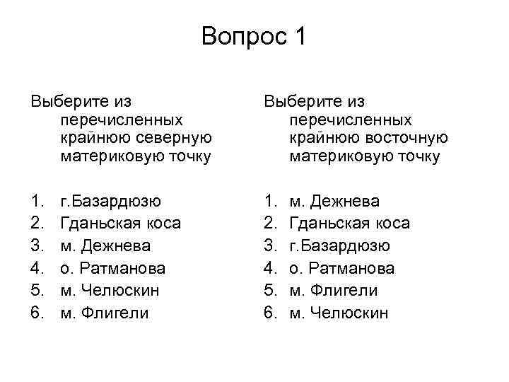Вопрос 1 Выберите из перечисленных крайнюю северную материковую точку Выберите из перечисленных крайнюю восточную материковую точку 1. 2. 3. 4. 5. 6. г. Базардюзю Гданьская коса м. Дежнева о. Ратманова м. Челюскин м. Флигели м. Дежнева Гданьская коса г. Базардюзю о. Ратманова м. Флигели м. Челюскин