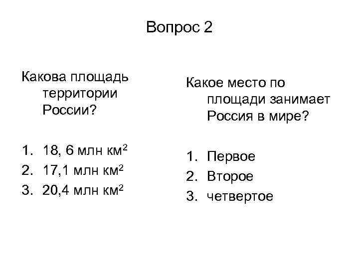 Вопрос 2 Какова площадь территории России? Какое место по площади занимает Россия в мире? 1. 18, 6 млн км 2 2. 17, 1 млн км 2 3. 20, 4 млн км 2 1. Первое 2. Второе 3. четвертое