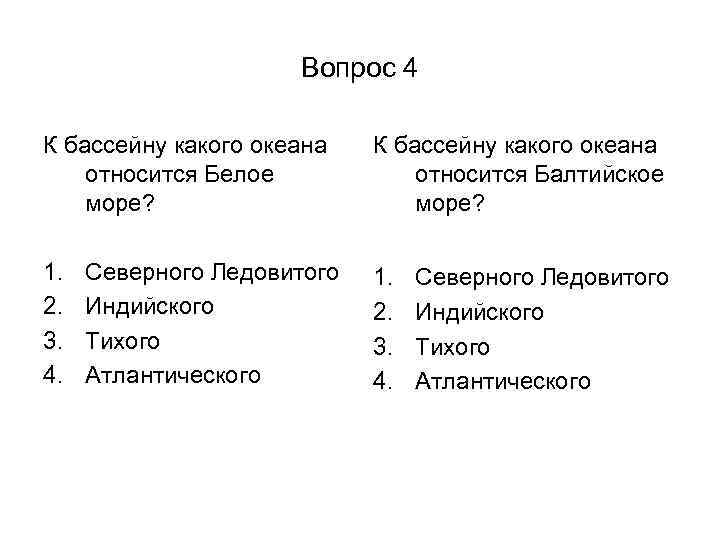 Вопрос 4 К бассейну какого океана относится Белое море? К бассейну какого океана относится Балтийское море? 1. 2. 3. 4. Северного Ледовитого Индийского Тихого Атлантического