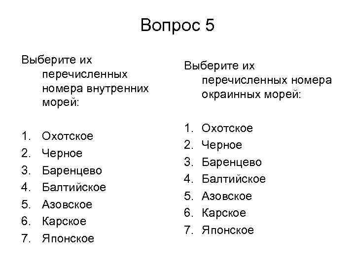 Вопрос 5 Выберите их перечисленных номера внутренних морей: 1. 2. 3. 4. 5. 6. 7. Охотское Черное Баренцево Балтийское Азовское Карское Японское Выберите их перечисленных номера окраинных морей: 1. 2. 3. 4. 5. 6. 7. Охотское Черное Баренцево Балтийское Азовское Карское Японское