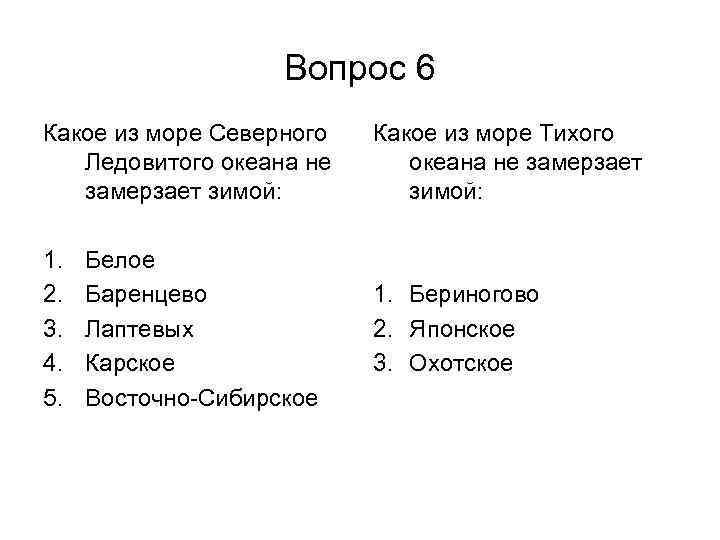 Вопрос 6 Какое из море Северного Ледовитого океана не замерзает зимой: Какое из море Тихого океана не замерзает зимой: 1. 2. 3. 4. 5. 1. Бериногово 2. Японское 3. Охотское Белое Баренцево Лаптевых Карское Восточно-Сибирское