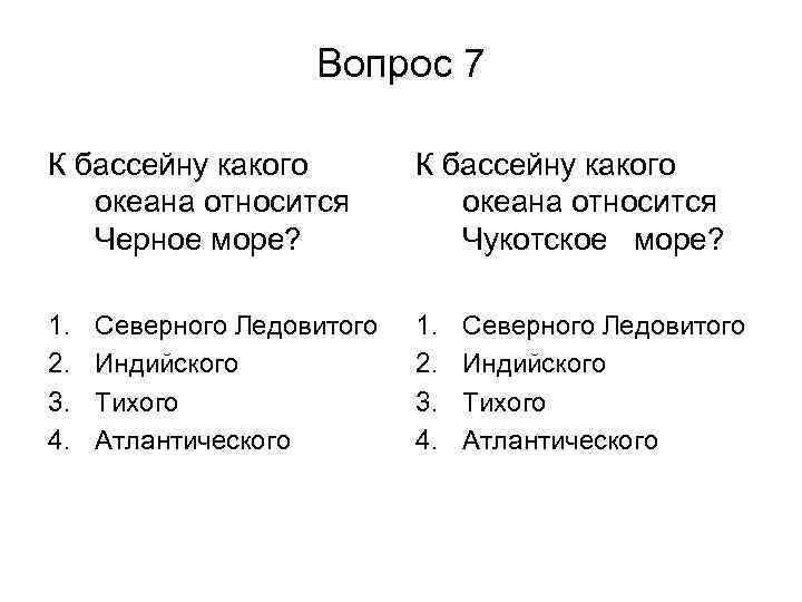 Вопрос 7 К бассейну какого океана относится Черное море? К бассейну какого океана относится Чукотское море? 1. 2. 3. 4. Северного Ледовитого Индийского Тихого Атлантического