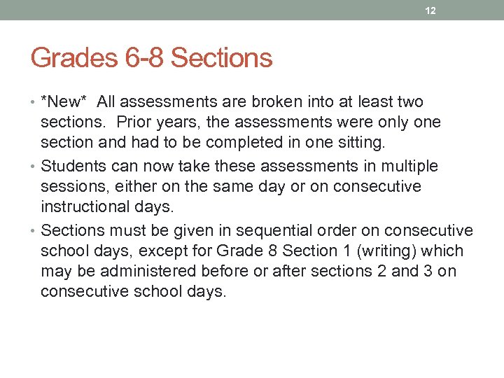 12 Grades 6 -8 Sections • *New* All assessments are broken into at least two sections. Prior years, the assessments were only one section and had to be completed in one sitting. • Students can now take these assessments in multiple sessions, either on the same day or on consecutive instructional days. • Sections must be given in sequential order on consecutive school days, except for Grade 8 Section 1 (writing) which may be administered before or after sections 2 and 3 on consecutive school days.
