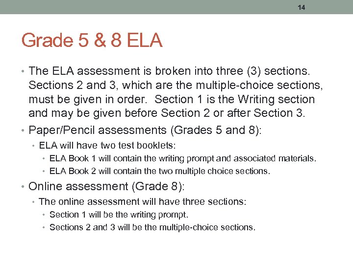 14 Grade 5 & 8 ELA • The ELA assessment is broken into three (3) sections. Sections 2 and 3, which are the multiple-choice sections, must be given in order. Section 1 is the Writing section and may be given before Section 2 or after Section 3. • Paper/Pencil assessments (Grades 5 and 8): • ELA will have two test booklets: • ELA Book 1 will contain the writing prompt and associated materials. • ELA Book 2 will contain the two multiple choice sections. • Online assessment (Grade 8): • The online assessment will have three sections: • Section 1 will be the writing prompt. • Sections 2 and 3 will be the multiple-choice sections.