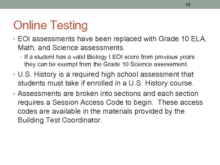16 Online Testing • EOI assessments have been replaced with Grade 10 ELA, Math, and Science assessments. • If a student has a valid Biology I EOI score from previous years they can be exempt from the Grade 10 Science assessment. • U. S. History is a required high school assessment that students must take if enrolled in a U. S. History course. • Assessments are broken into sections and each section requires a Session Access Code to begin. These access codes are available in the materials provided by the Building Test Coordinator.