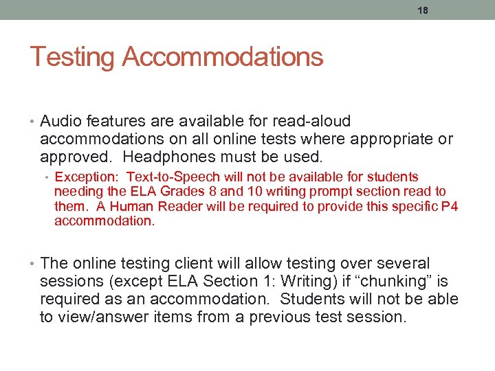 18 Testing Accommodations • Audio features are available for read-aloud accommodations on all online tests where appropriate or approved. Headphones must be used. • Exception: Text-to-Speech will not be available for students needing the ELA Grades 8 and 10 writing prompt section read to them. A Human Reader will be required to provide this specific P 4 accommodation. • The online testing client will allow testing over several sessions (except ELA Section 1: Writing) if “chunking” is required as an accommodation. Students will not be able to view/answer items from a previous test session.