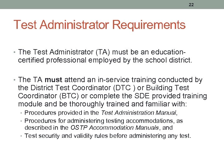 22 Test Administrator Requirements • The Test Administrator (TA) must be an education- certified professional employed by the school district. • The TA must attend an in-service training conducted by the District Test Coordinator (DTC ) or Building Test Coordinator (BTC) or complete the SDE provided training module and be thoroughly trained and familiar with: • Procedures provided in the Test Administration Manual, • Procedures for administering testing accommodations, as described in the OSTP Accommodation Manuals, and • Test security and validity rules before administering any test.