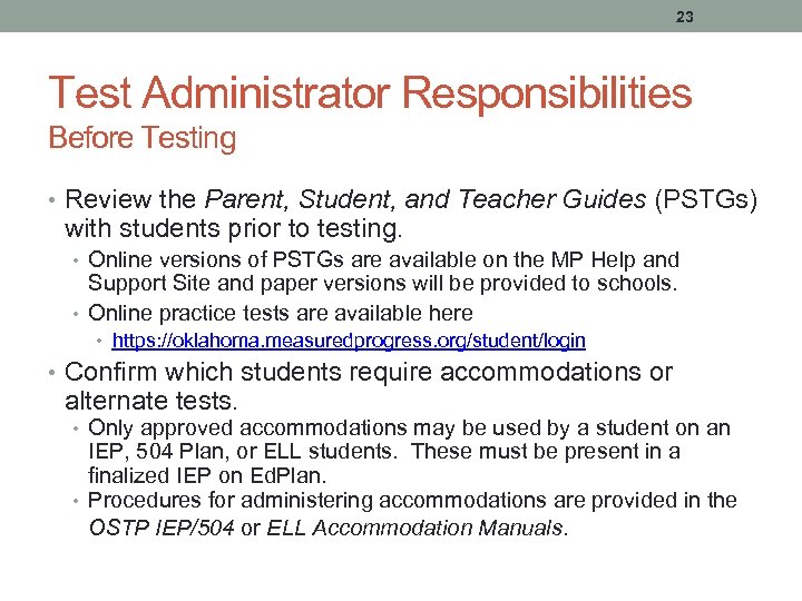 23 Test Administrator Responsibilities Before Testing • Review the Parent, Student, and Teacher Guides (PSTGs) with students prior to testing. • Online versions of PSTGs are available on the MP Help and Support Site and paper versions will be provided to schools. • Online practice tests are available here • https: //oklahoma. measuredprogress. org/student/login • Confirm which students require accommodations or alternate tests. • Only approved accommodations may be used by a student on an IEP, 504 Plan, or ELL students. These must be present in a finalized IEP on Ed. Plan. • Procedures for administering accommodations are provided in the OSTP IEP/504 or ELL Accommodation Manuals.