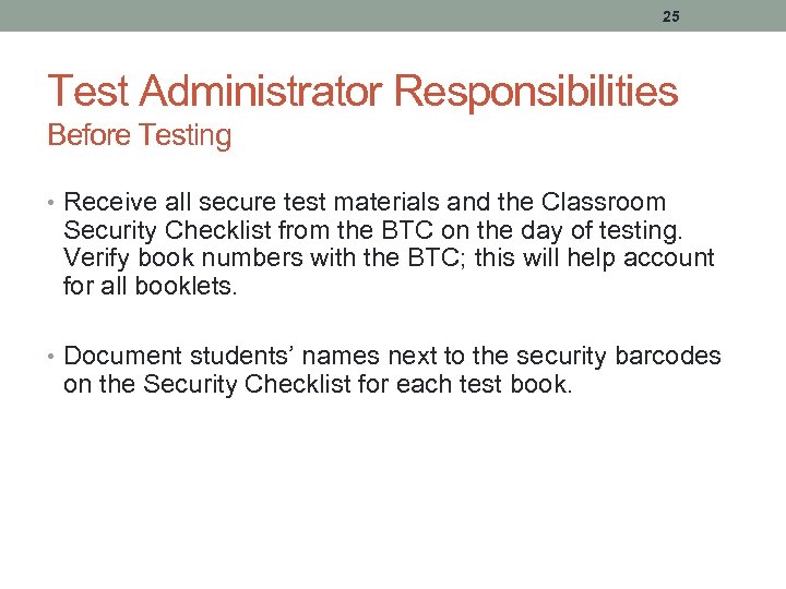 25 Test Administrator Responsibilities Before Testing • Receive all secure test materials and the Classroom Security Checklist from the BTC on the day of testing. Verify book numbers with the BTC; this will help account for all booklets. • Document students’ names next to the security barcodes on the Security Checklist for each test book.