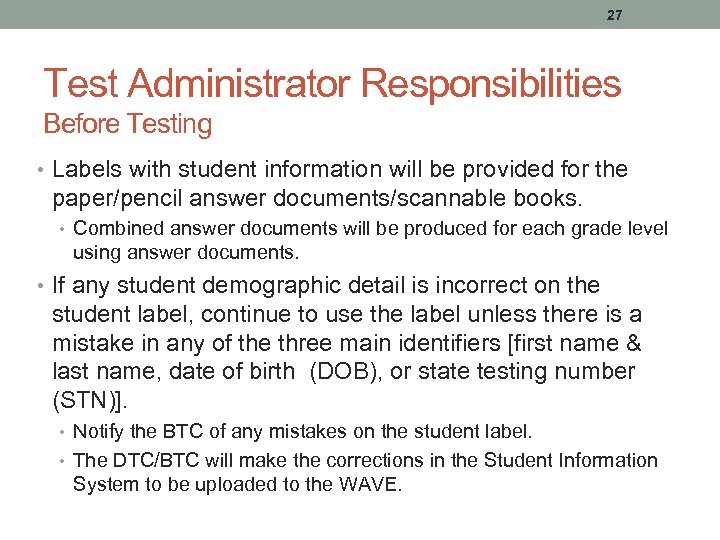 26 Test Administrator Responsibilities Before Testing • Remove or cover all visual aids and clues throughout the test administration, regardless of the content area being tested and the length of time the visuals have been up in the classroom. (Clocks may remain uncovered. ) • Posters • Maps • Charts • Timelines • Alphabet • Number lines