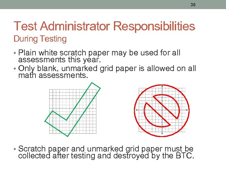 30 Test Administrator Responsibilities During Testing • Plain white scratch paper may be used for all assessments this year. • Only blank, unmarked grid paper is allowed on all math assessments. • Scratch paper and unmarked grid paper must be collected after testing and destroyed by the BTC.