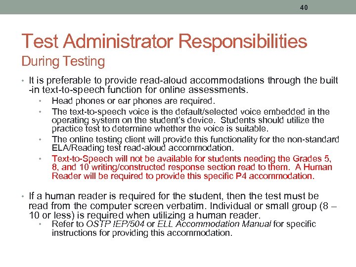 40 Test Administrator Responsibilities During Testing • It is preferable to provide read-aloud accommodations through the built -in text-to-speech function for online assessments. • • Head phones or ear phones are required. The text-to-speech voice is the default/selected voice embedded in the operating system on the student’s device. Students should utilize the practice test to determine whether the voice is suitable. The online testing client will provide this functionality for the non-standard ELA/Reading test read-aloud accommodation. Text-to-Speech will not be available for students needing the Grades 5, 8, and 10 writing/constructed response section read to them. A Human Reader will be required to provide this specific P 4 accommodation. • If a human reader is required for the student, then the test must be read from the computer screen verbatim. Individual or small group (8 – 10 or less) is required when utilizing a human reader. • Refer to OSTP IEP/504 or ELL Accommodation Manual for specific instructions for providing this accommodation.