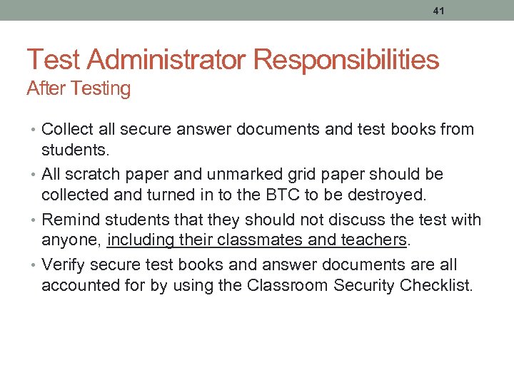 41 Test Administrator Responsibilities After Testing • Collect all secure answer documents and test books from students. • All scratch paper and unmarked grid paper should be collected and turned in to the BTC to be destroyed. • Remind students that they should not discuss the test with anyone, including their classmates and teachers. • Verify secure test books and answer documents are all accounted for by using the Classroom Security Checklist.