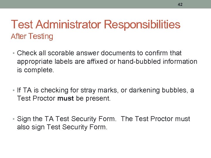 42 Test Administrator Responsibilities After Testing • Check all scorable answer documents to confirm that appropriate labels are affixed or hand-bubbled information is complete. • If TA is checking for stray marks, or darkening bubbles, a Test Proctor must be present. • Sign the TA Test Security Form. The Test Proctor must also sign Test Security Form.