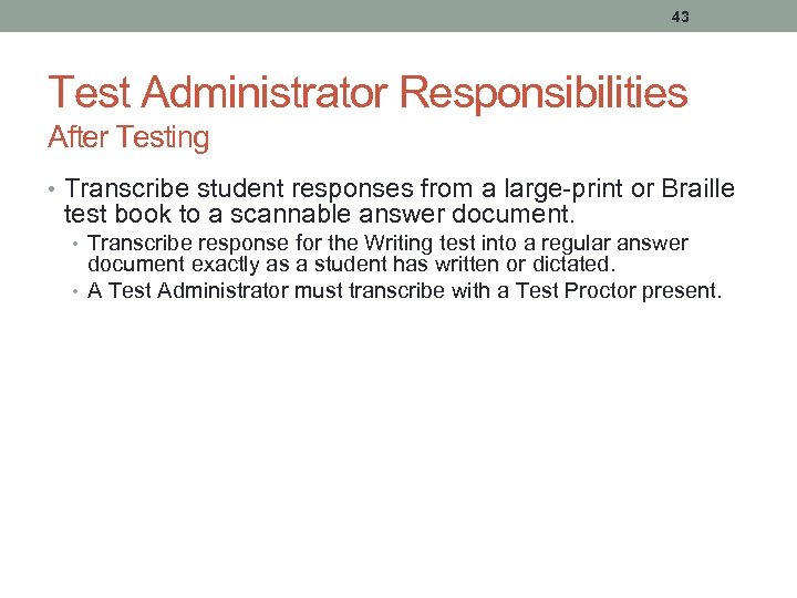 43 Test Administrator Responsibilities After Testing • Transcribe student responses from a large-print or Braille test book to a scannable answer document. • Transcribe response for the Writing test into a regular answer document exactly as a student has written or dictated. • A Test Administrator must transcribe with a Test Proctor present.