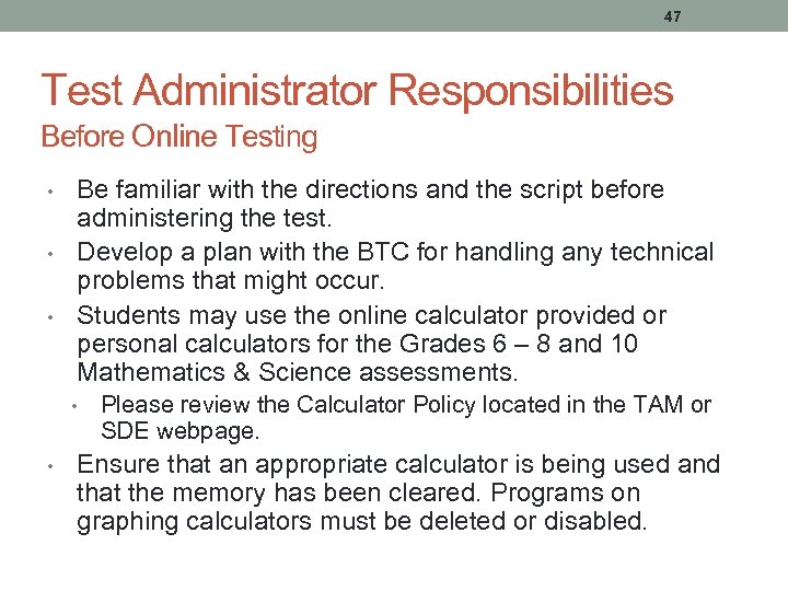 47 Test Administrator Responsibilities Before Online Testing • • • Be familiar with the directions and the script before administering the test. Develop a plan with the BTC for handling any technical problems that might occur. Students may use the online calculator provided or personal calculators for the Grades 6 – 8 and 10 Mathematics & Science assessments. • • Please review the Calculator Policy located in the TAM or SDE webpage. Ensure that an appropriate calculator is being used and that the memory has been cleared. Programs on graphing calculators must be deleted or disabled.