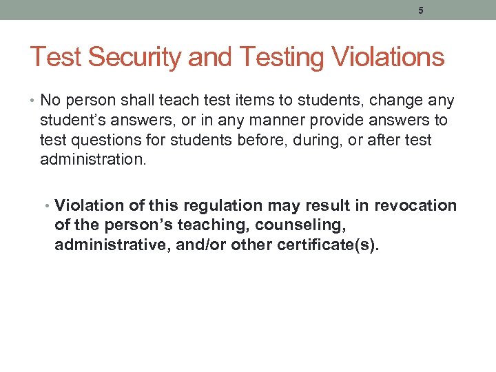 4 Test Security and Testing Violations • Reproduction in any form of any copyrighted test materials, including test documents, Test Administration Manuals, and student pretest material, is a violation of federal copyright laws. • Every assessment shall be administered by an education- certified professional employed by the school district. • Every Test Administrator must be accompanied by a Test Proctor the entire duration of the test administration.