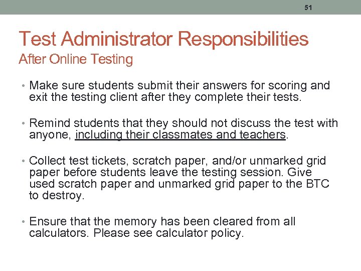 51 Test Administrator Responsibilities After Online Testing • Make sure students submit their answers for scoring and exit the testing client after they complete their tests. • Remind students that they should not discuss the test with anyone, including their classmates and teachers. • Collect test tickets, scratch paper, and/or unmarked grid paper before students leave the testing session. Give used scratch paper and unmarked grid paper to the BTC to destroy. • Ensure that the memory has been cleared from all calculators. Please see calculator policy.