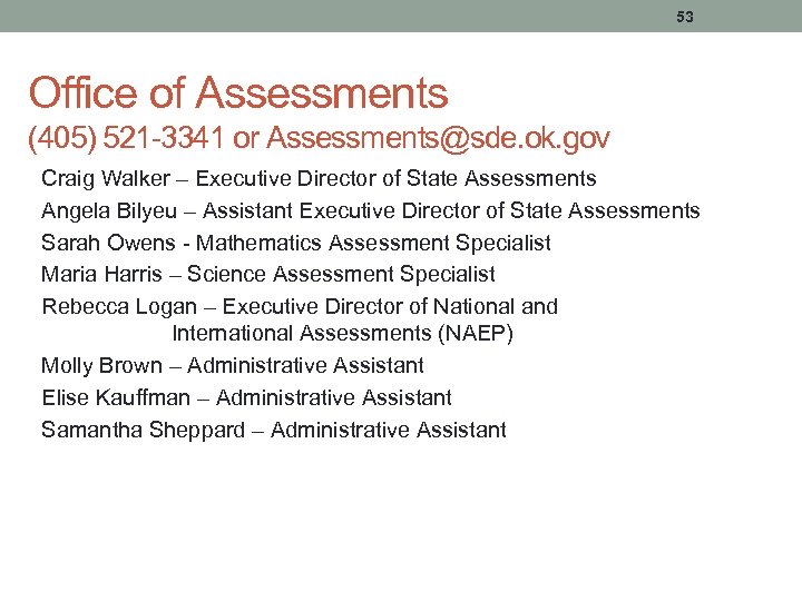 53 Office of Assessments (405) 521 -3341 or Assessments@sde. ok. gov Craig Walker – Executive Director of State Assessments Angela Bilyeu – Assistant Executive Director of State Assessments Sarah Owens - Mathematics Assessment Specialist Maria Harris – Science Assessment Specialist Rebecca Logan – Executive Director of National and International Assessments (NAEP) Molly Brown – Administrative Assistant Elise Kauffman – Administrative Assistant Samantha Sheppard – Administrative Assistant