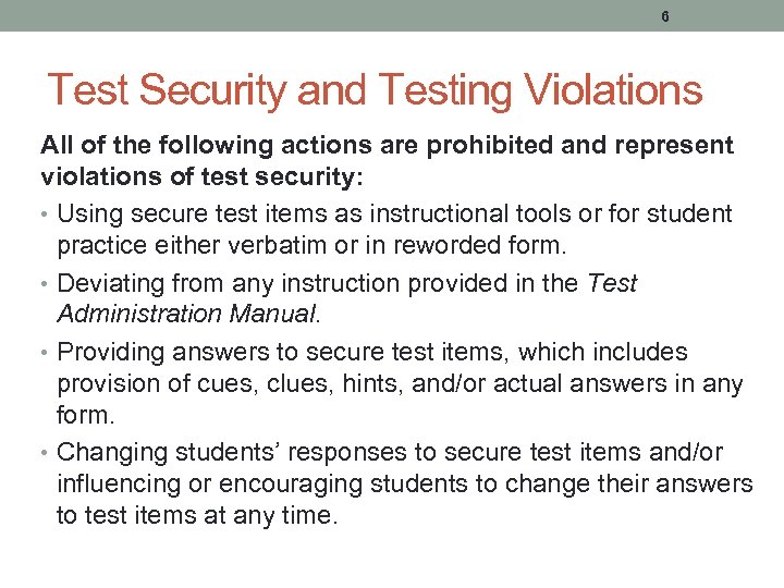 5 Test Security and Testing Violations • No person shall teach test items to students, change any student’s answers, or in any manner provide answers to test questions for students before, during, or after test administration. • Violation of this regulation may result in revocation of the person’s teaching, counseling, administrative, and/or other certificate(s).