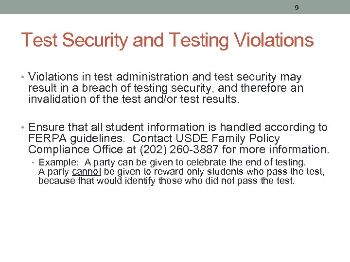 8 Test Security and Testing Violations • It is a violation to read secure test items orally to students at any time before, during, or after the test administration unless it is an Individual Education Program (IEP), Section 504 Plan, or English Language Learners (ELL) accommodation. • The Grades 3 – 8 & Grade 10 ELA multiple-choice sections may only be read aloud as an SDE-approved accommodation for students who qualify for the ELA read-aloud nonstandard accommodation. This includes passages and items.