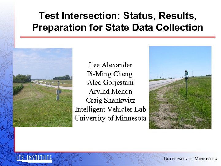 Test Intersection: Status, Results, Preparation for State Data Collection Lee Alexander Pi-Ming Cheng Alec Gorjestani Arvind Menon Craig Shankwitz Intelligent Vehicles Lab University of Minnesota
