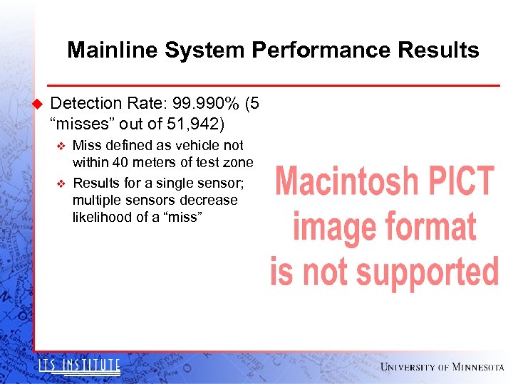 Mainline System Performance Results u Detection Rate: 99. 990% (5 “misses” out of 51, 942) v v Miss defined as vehicle not within 40 meters of test zone Results for a single sensor; multiple sensors decrease likelihood of a “miss”