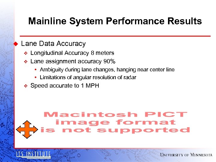 Mainline System Performance Results u Lane Data Accuracy v v Longitudinal Accuracy 8 meters Lane assignment accuracy 90% • Ambiguity during lane changes, hanging near center line • Limitations of angular resolution of radar v Speed accurate to 1 MPH