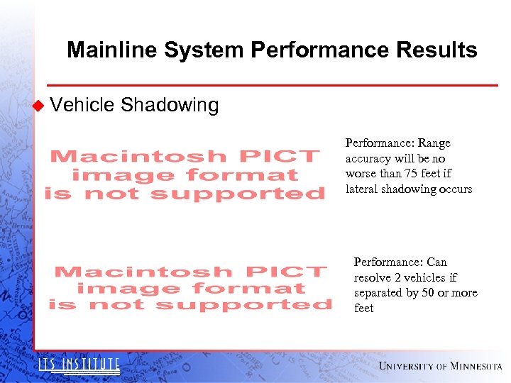 Mainline System Performance Results u Vehicle Shadowing Performance: Range accuracy will be no worse than 75 feet if lateral shadowing occurs Performance: Can resolve 2 vehicles if separated by 50 or more feet