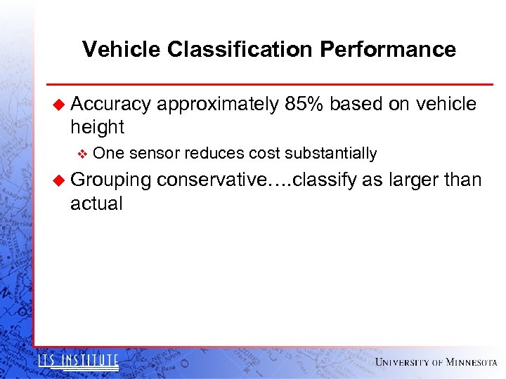 Vehicle Classification Performance u Accuracy approximately 85% based on vehicle height v One sensor reduces cost substantially u Grouping actual conservative…. classify as larger than