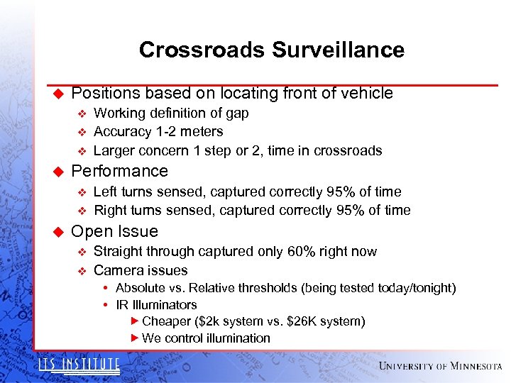 Crossroads Surveillance u Positions based on locating front of vehicle v v v u Performance v v u Working definition of gap Accuracy 1 -2 meters Larger concern 1 step or 2, time in crossroads Left turns sensed, captured correctly 95% of time Right turns sensed, captured correctly 95% of time Open Issue v v Straight through captured only 60% right now Camera issues • Absolute vs. Relative thresholds (being tested today/tonight) • IR Illuminators Cheaper ($2 k system vs. $26 K system) We control illumination
