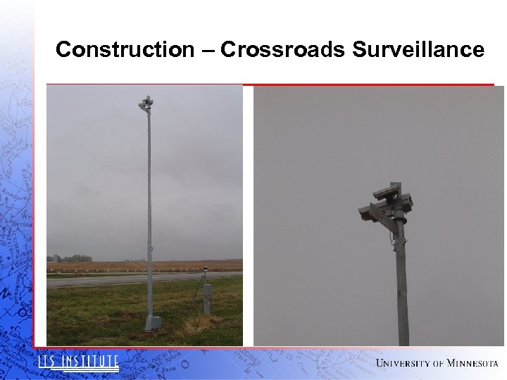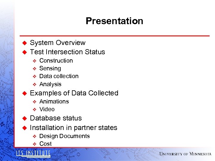 Presentation u u System Overview Test Intersection Status v v u Examples of Data Collected v v u u Construction Sensing Data collection Analysis Animations Video Database status Installation in partner states v v Design Documents Cost