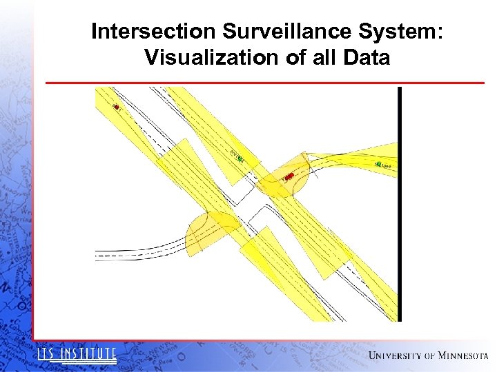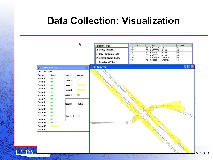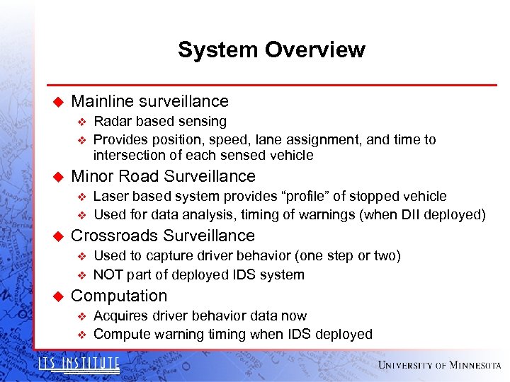System Overview u Mainline surveillance v v u Minor Road Surveillance v v u Laser based system provides “profile” of stopped vehicle Used for data analysis, timing of warnings (when DII deployed) Crossroads Surveillance v v u Radar based sensing Provides position, speed, lane assignment, and time to intersection of each sensed vehicle Used to capture driver behavior (one step or two) NOT part of deployed IDS system Computation v v Acquires driver behavior data now Compute warning timing when IDS deployed
