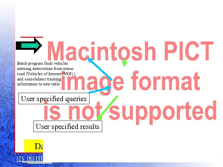 Batch program finds vehicles entering intersection from minor road (Vehicles of Interest (VOI) ) and consolidates tracking information to new table User specified queries User specified results Data Acquisition – IV Lab Analysis Processes