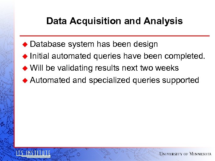 Data Acquisition and Analysis u Database system has been design u Initial automated queries have been completed. u Will be validating results next two weeks u Automated and specialized queries supported