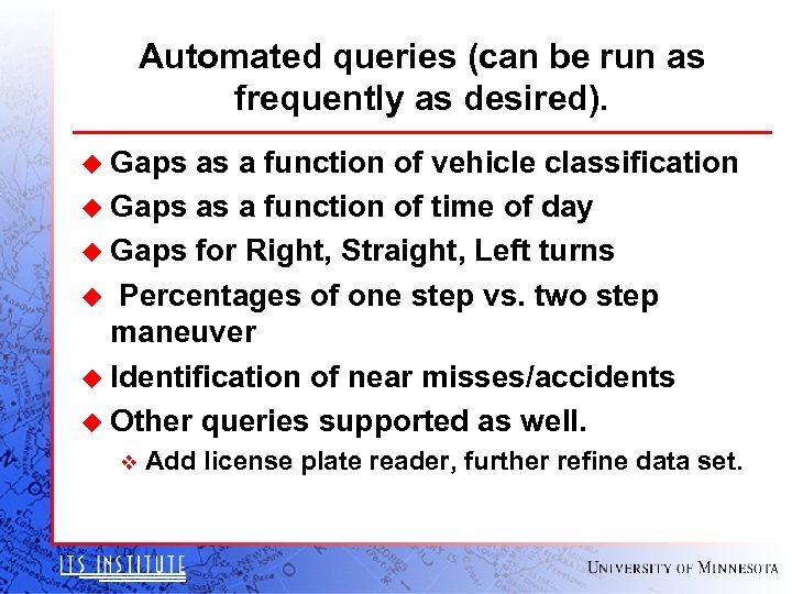 Automated queries (can be run as frequently as desired). u Gaps as a function of vehicle classification u Gaps as a function of time of day u Gaps for Right, Straight, Left turns u Percentages of one step vs. two step maneuver u Identification of near misses/accidents u Other queries supported as well. v Add license plate reader, further refine data set.
